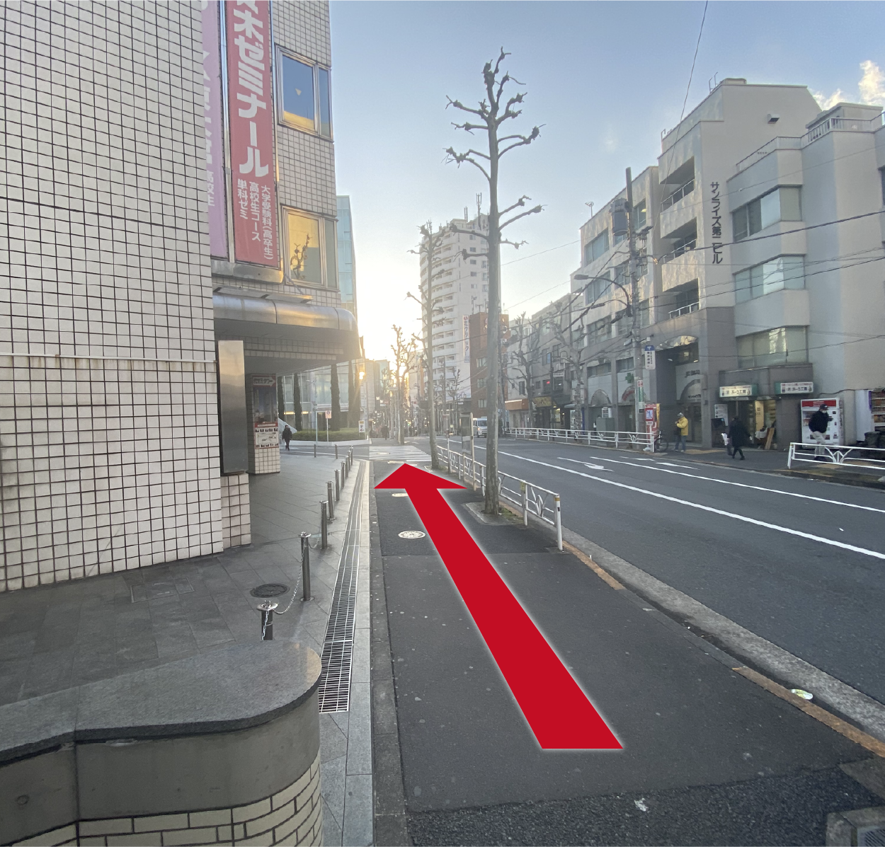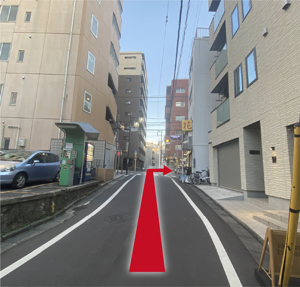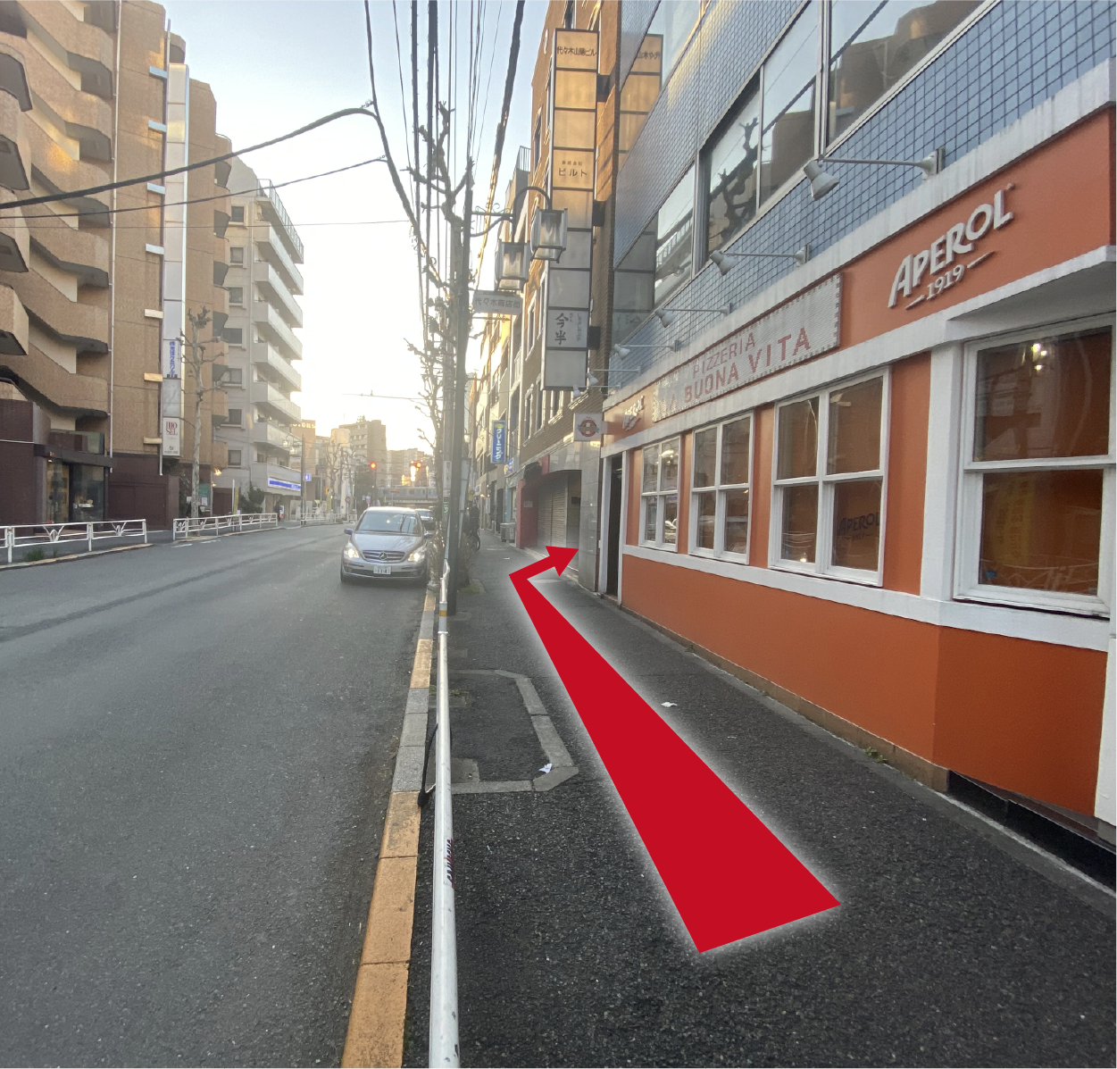 右に壁が赤い建物が見えたら、その次のビルがゴールです。