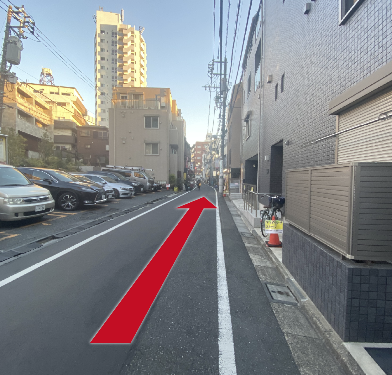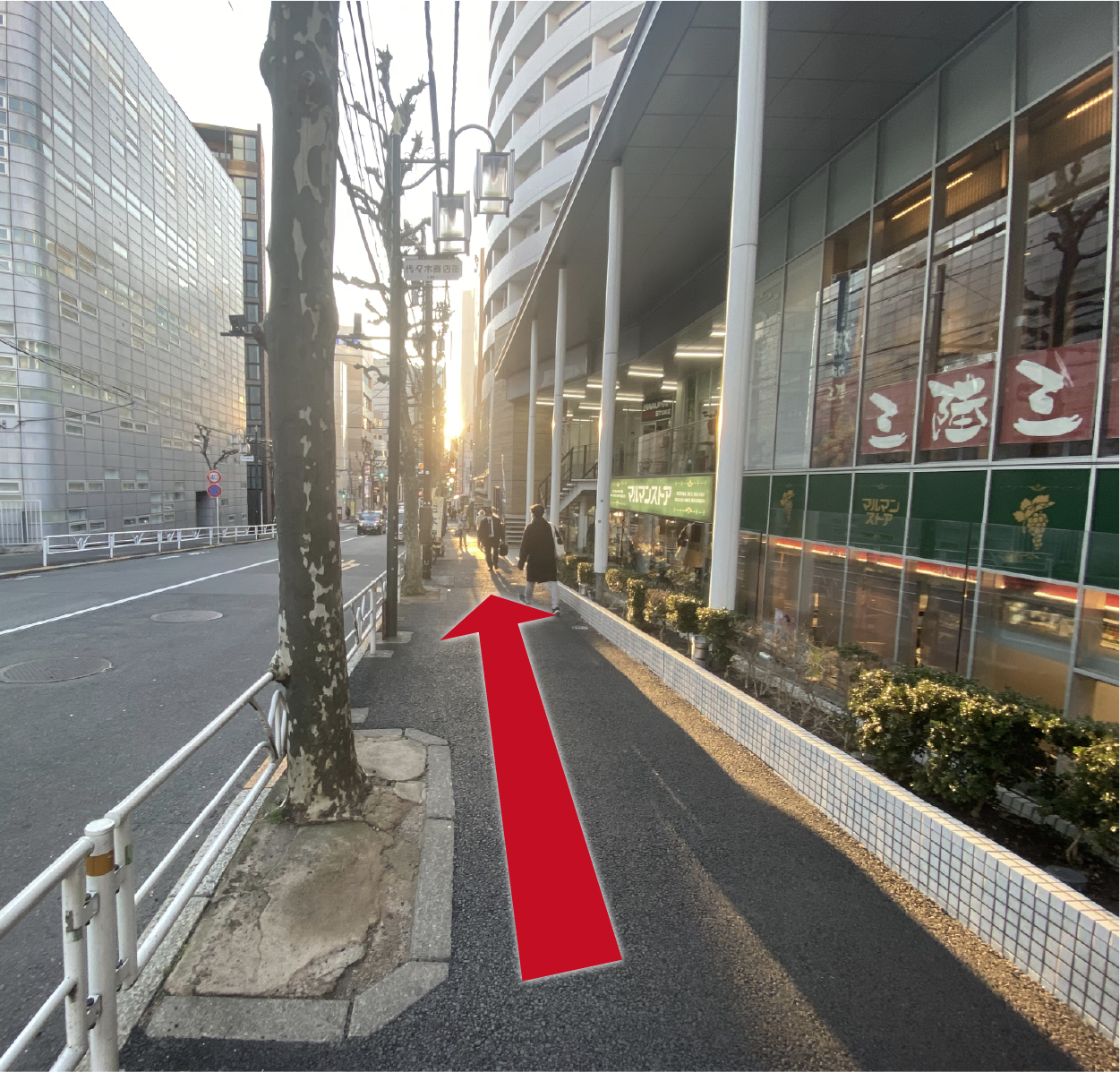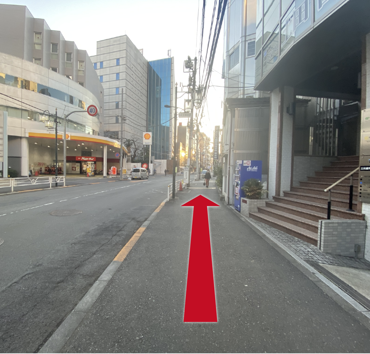 右に壁が赤い建物が見えたら、その次のビルがゴールです。