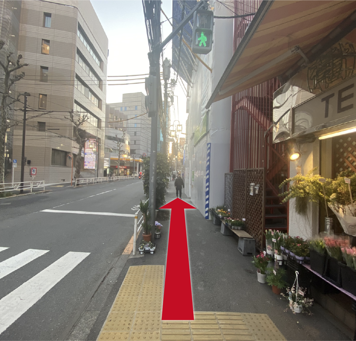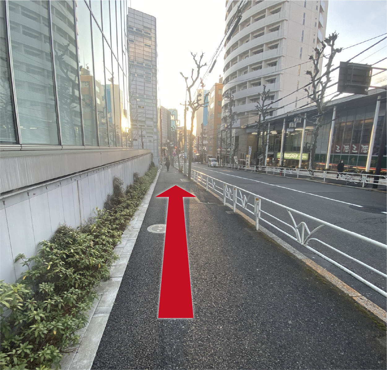 出口を出たら道なりに直進します。